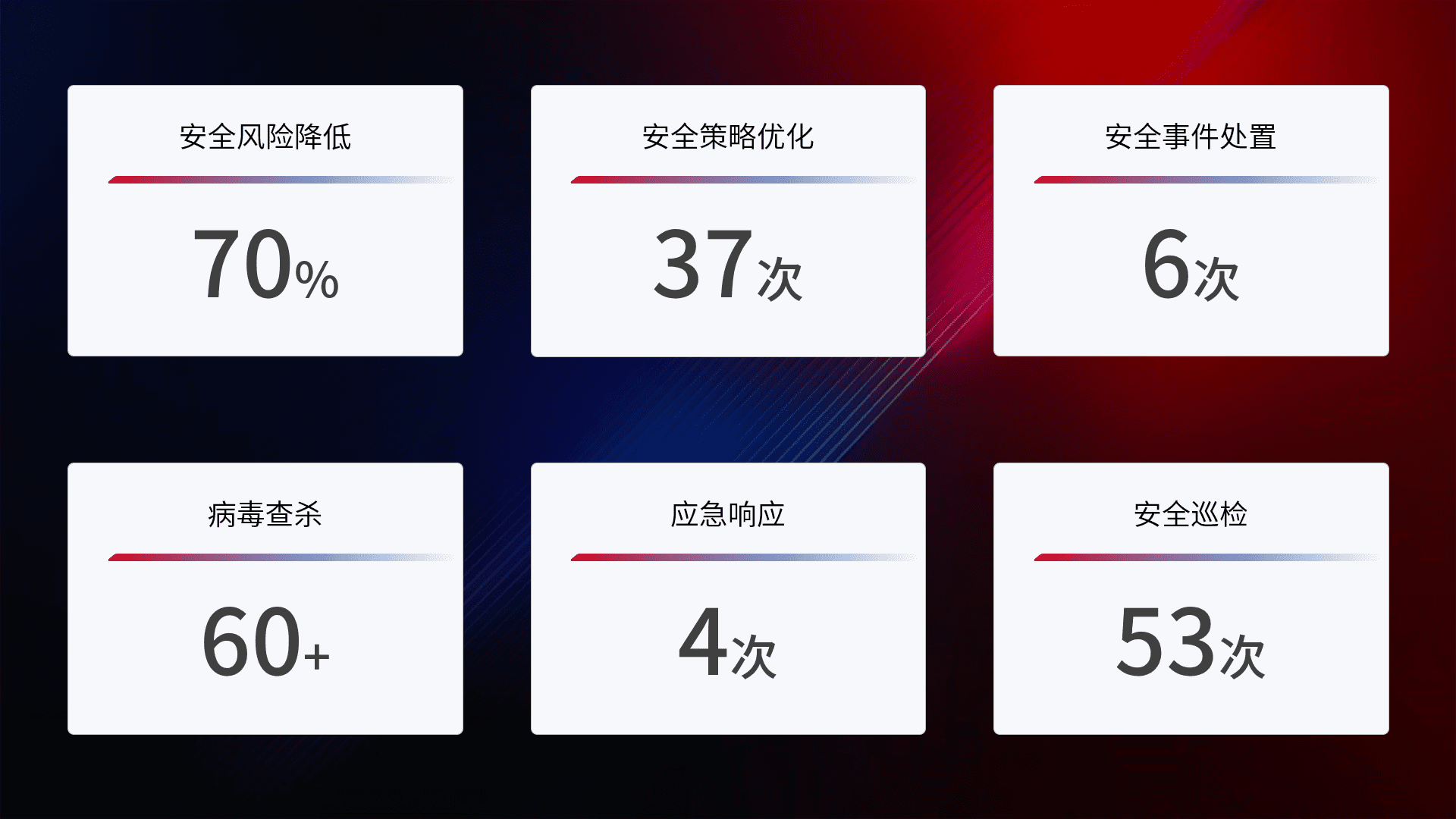 提供全面的安全事件报告体系,,,,包括处置报告、、、、周报、、、、季度和年度总结,,结合持续监控,,帮助客户深入了解网络安全状况。。