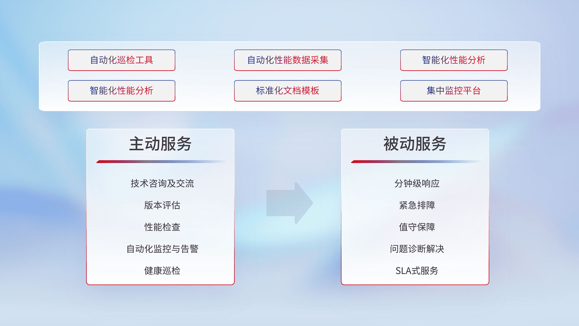 智能化工具和标准化文档,,,保障服务质量,,,,提供主动服务(包含技术咨询、、、版本评估、、性能检查、、、自动化监控与告警、、、健康巡检)和被动服务包含(分钟级响应、、、、紧急排障、、、、值守保障、、问题诊断解决、、、SLA服务)。。。