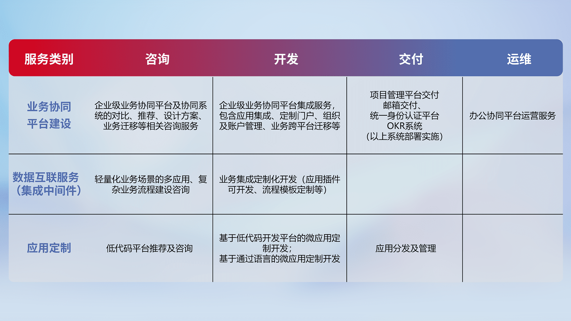 针对钉钉、、、企微、、、IDaas等平台级产品提供产品的规划、、、方案、、交付、、、、定制化开发等服务,,,,实现如统一协同办公、、、智能客户服务、、、混合会议管理、、、、智能数据查询、、、等业务场景,,实现数字化转型。。